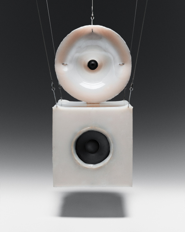 - The speakers are fabricated entirely in Studio S II’s Brooklyn shop, where the team has access to a laser cutter. The silicone skin is completely hand-cast to wrap around the internal acrylic speaker box, requiring it to be flexible, resilient, and strong enough to be suspended and vibrate under sound.