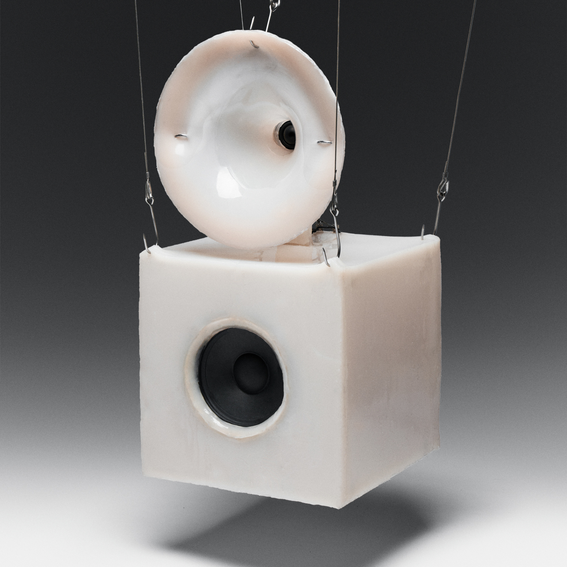 - The speakers are fabricated entirely in Studio S II’s Brooklyn shop, where the team has access to a laser cutter. The silicone skin is completely hand-cast to wrap around the internal acrylic speaker box, requiring it to be flexible, resilient, and strong enough to be suspended and vibrate under sound.