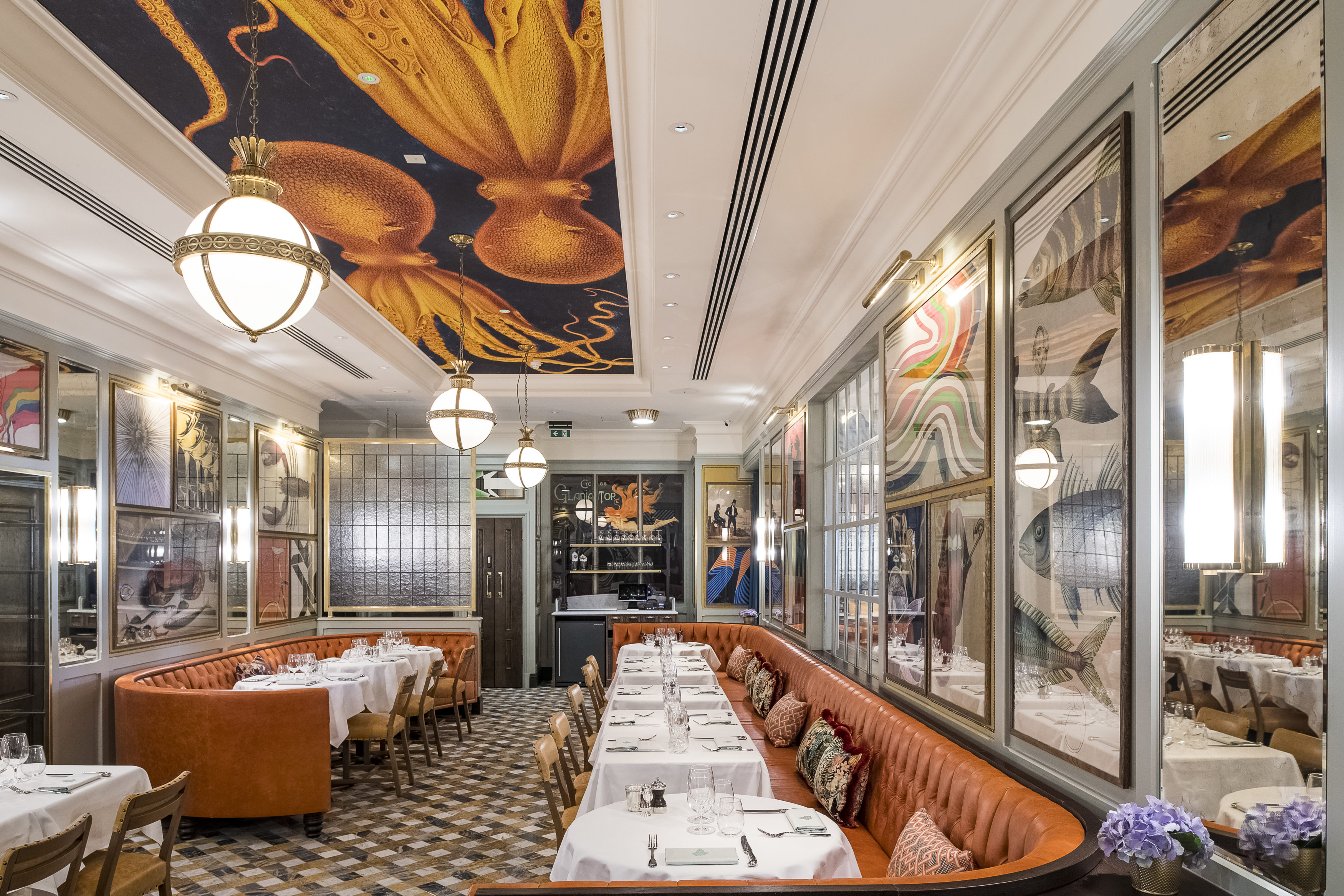 Opened in May 2018, the restaurant has an informal yet sophisticated interior design, with vintage prints and artwork inspired by Brighton lining its walls. Martin Brudnizki Design Studio consulted on the interiors. Even inside this seaside restaurant, diners can enjoy the Brighton beach, pier, tropical plants, and sea life—like the giant, intricately painted squids swimming across the ceiling in one of the rooms.
