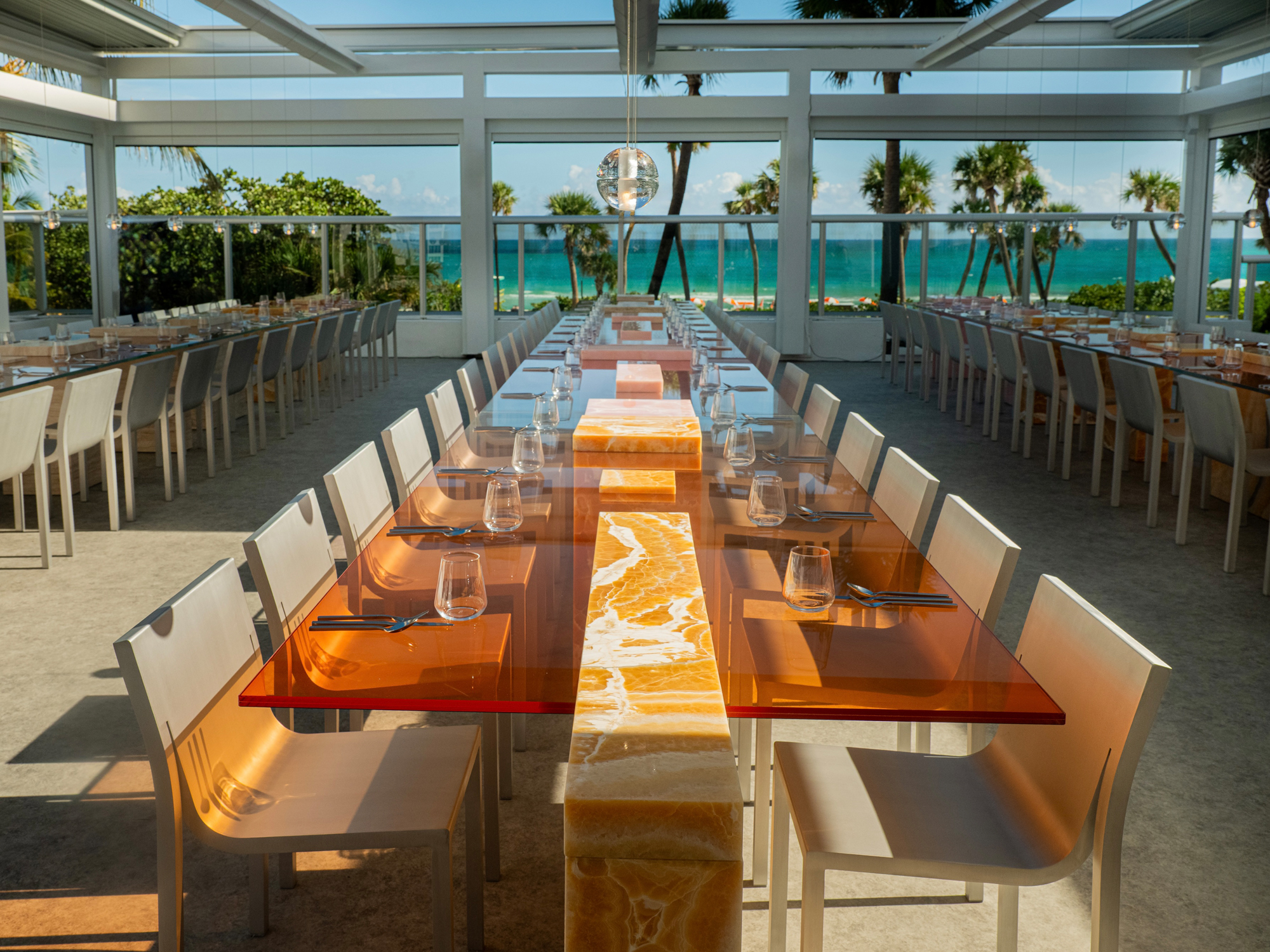 - A view of the minimalist furniture at One@Tokyo’s Skytree rooftop lounge.