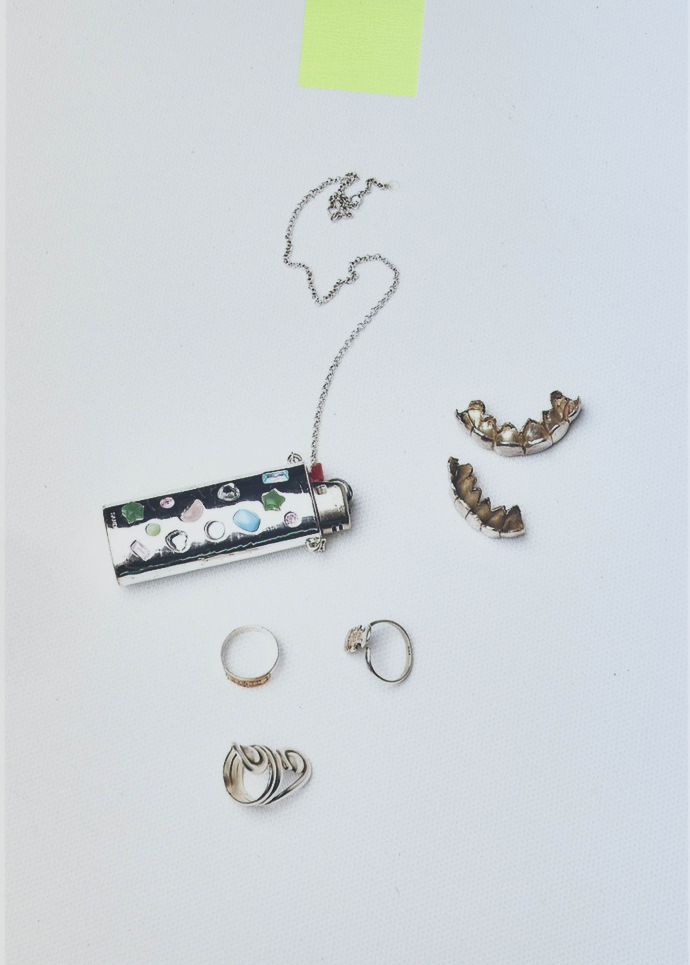 → When it comes to her style on set, Elizabeth doesn’t sweat the details. She’s all about comfort and practicality. “I don’t collect clothes or accessories that are garbage in terms of single-use things,” she says. Her everyday essentials include a lighter, along with jewelry and a pair of grills by Secret of Manna.