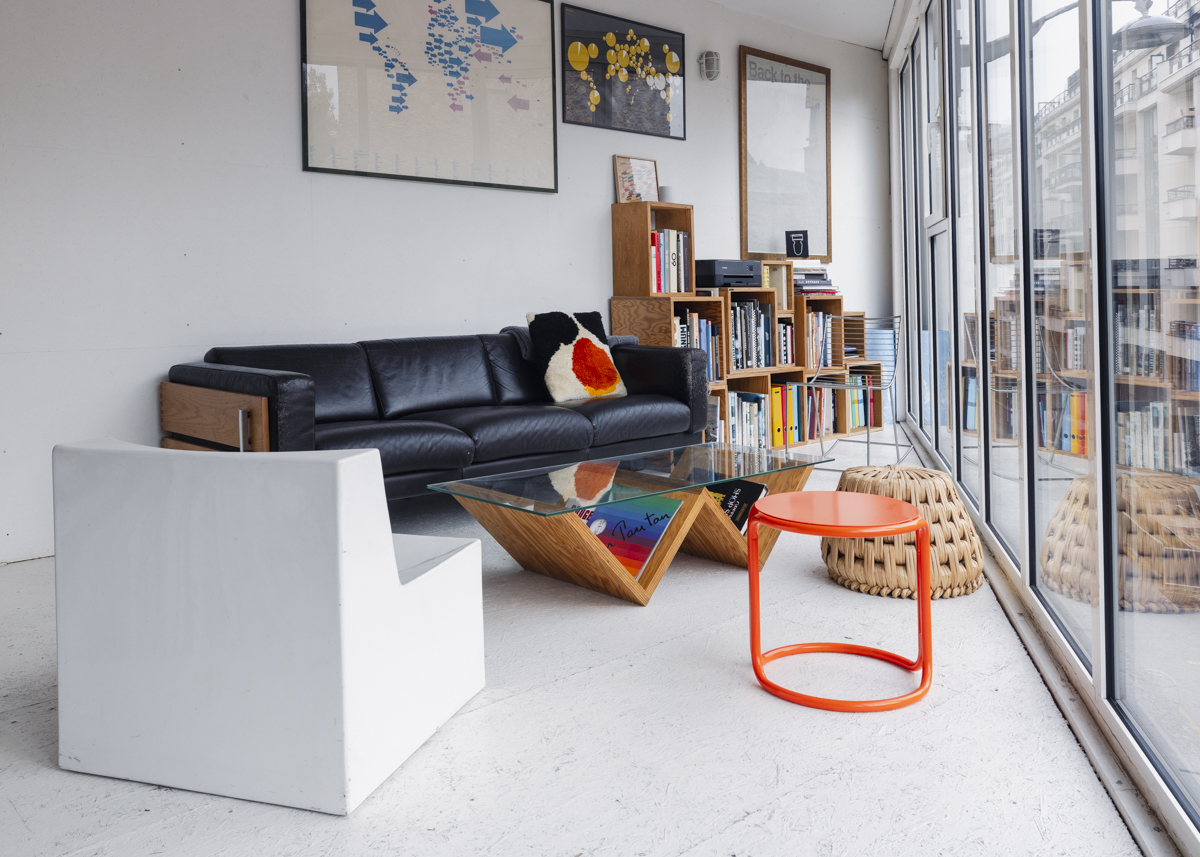 The footprint of Yorgo’s entire home is shaped like a triangle. “That’s why I’ve nicknamed it ‘Saganaki House,’” he says. “Saganaki is a traditional Greek fried cheese. It looks like a slice of pizza—very triangular.” Sofa by Robin Day for Habitat scratched by Clou, Yorgo’s previous cat; #wextendedtable by Yorgo; metal chair and resin chair by his father, the Greek sculptor Philolaos Tloupas; wicker pouf by Maison Integre; orange outdoor stool by Gae Aulenti, 1972 Prisunic re-edition by Monoprix.