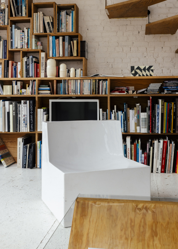 - In the living room, a Serif Samsung TV by the Bouroullec brothers peeks out from behind Philolaos Tloupas’ white resin chair. Martin Margiela Matryoshka’s nesting dolls sit atop custom modular shelves made by a friend of Yorgo’s. “The shelves are resting on each other,” he says. “I hate when some of them aren’t straight. One of them is cheating; it’s resting on a design book.”