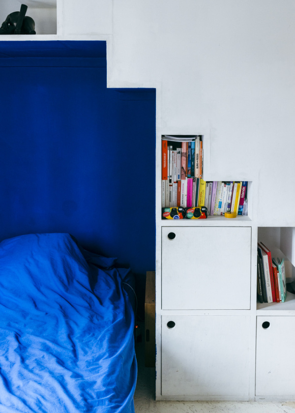 “It was in 2010 when I found this home,” says Greek designer Yorgo Tloupas. “I got really lucky. There was quite a bit of work I wanted to do at the start. I literally moved out because everything was gutted. We even drilled down and added extra floors to the space.” Yorgo’s bedroom within his single-family residence on the outskirts of Paris. Disposable cameras by Agnst Design