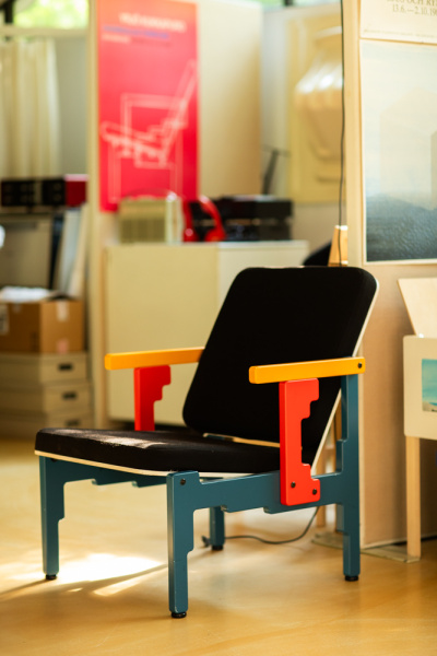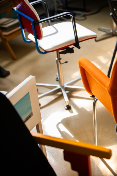 - The studio environment embodies the megatrends of the 1960s. For Yrjö it meant an ascetic and modern approach to work. The Sirkus office chair, 1984, is visible in the upper half of the photo. A glimpse of orange upholstered Moderno chair, designed in 1956, is on the right.