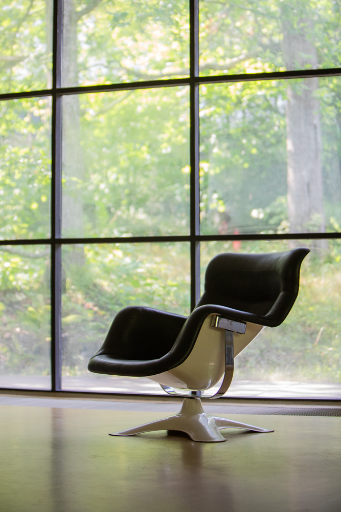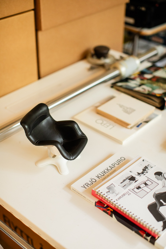 - A scale model of Yrjö’s Karuselli lounge chair sits on a desk in the studio. The chair was designed to provide the most relaxed sitting position possible. Yrjö spent several years sculpting the chair, wrapping himself in chicken wire and making a plaster cast of his body in a lounging posture in order to achieve the perfect dimensions. When the chair’s form was realized in 1964, it became an immediate international success.