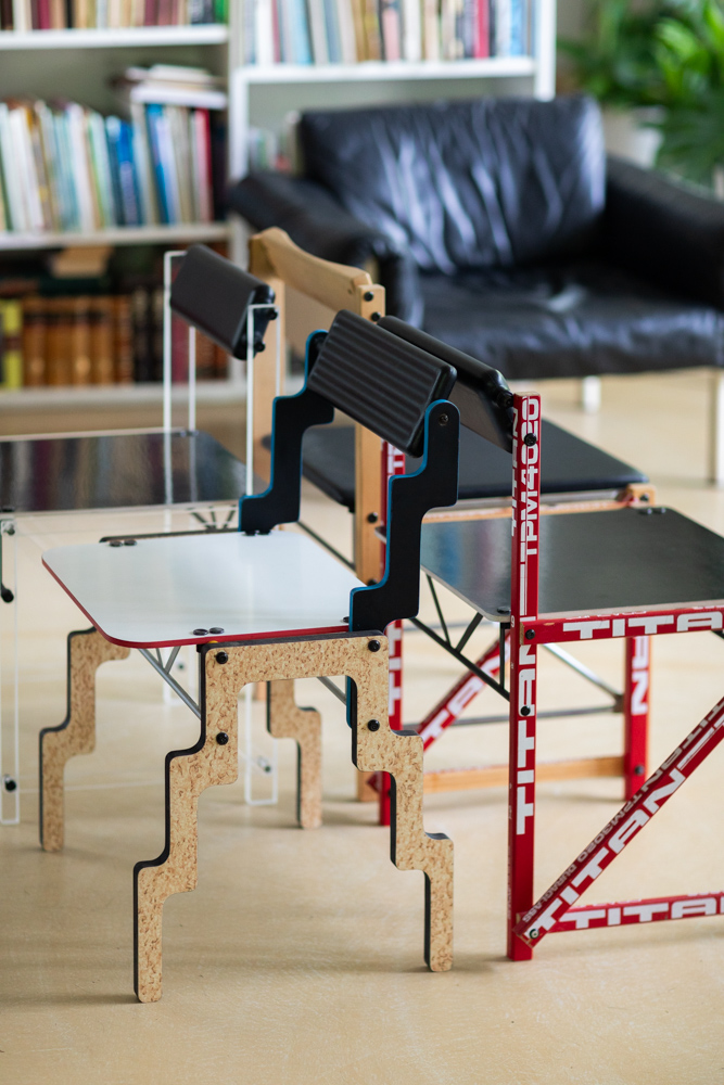 - Yrjö’s Nelonen Curly Birch Telescope Foot chair (left) and Nelonen Titan chair (right). The Titan was made with ice hockey sticks in the 1990s.