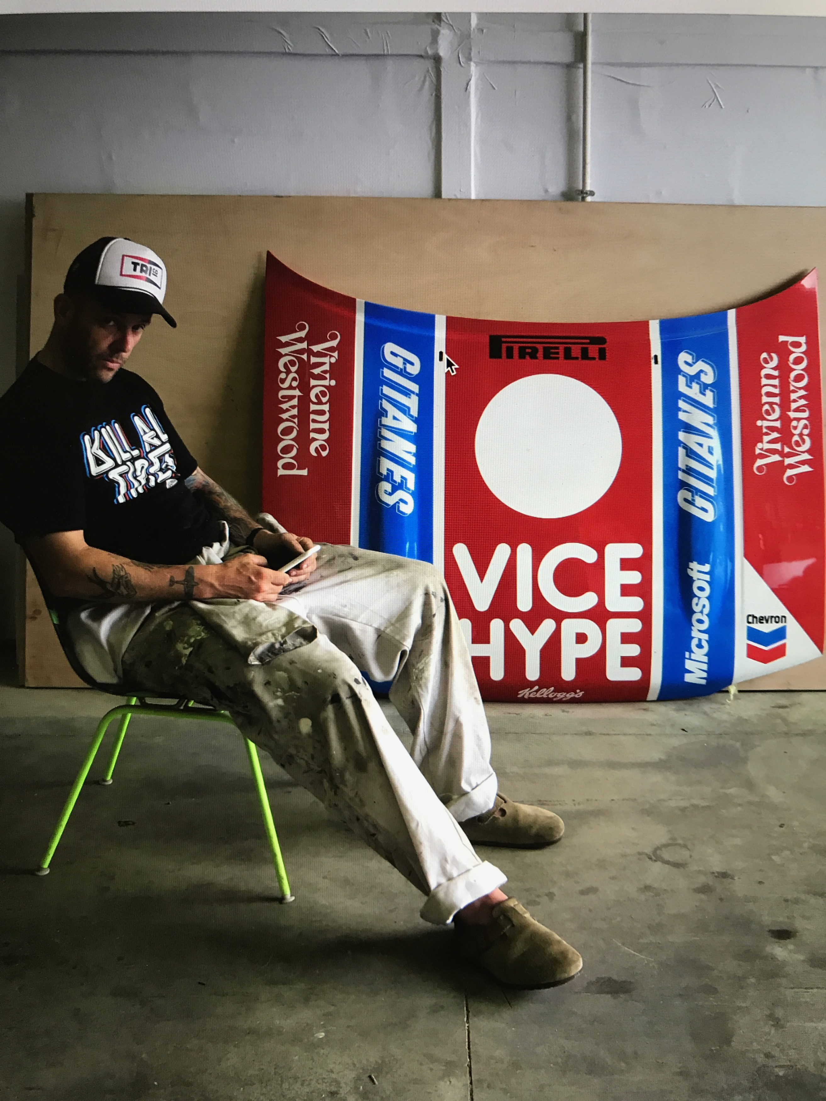David Gwyther, seated with one of his bold hood designs, checking the phone. COURTESY OF DEATH SPRAY CUSTOM.