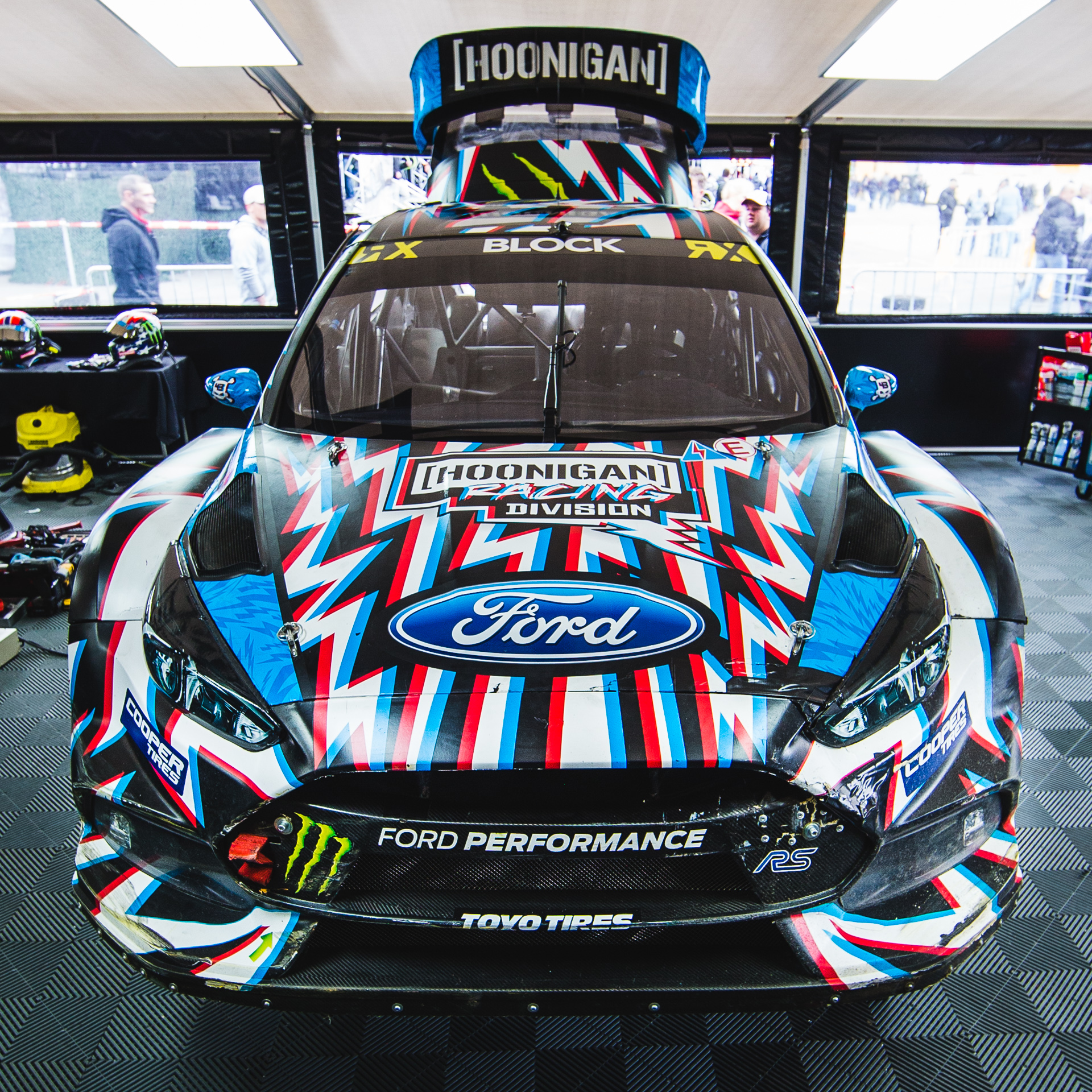 3D stripes dart up, down, and around Gwyther’s attention-grabbing design for Hoonigan Racing’s Ford Focus RS RX rallycross cars. COURTESY OF DEATH SPRAY CUSTOM.