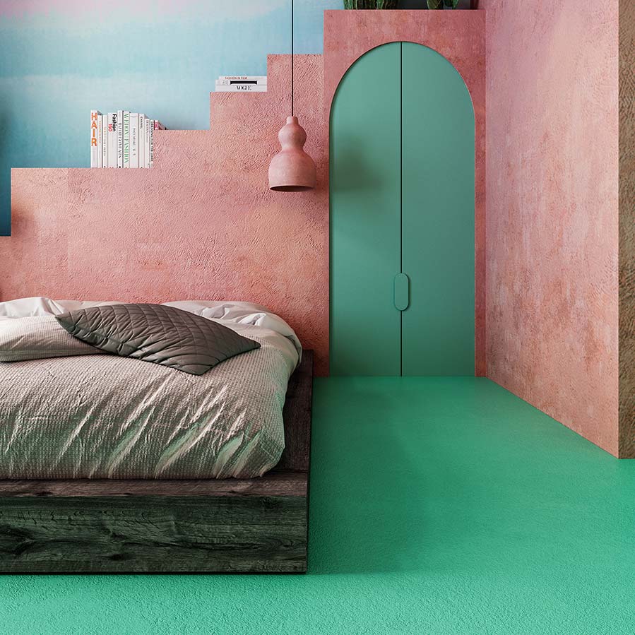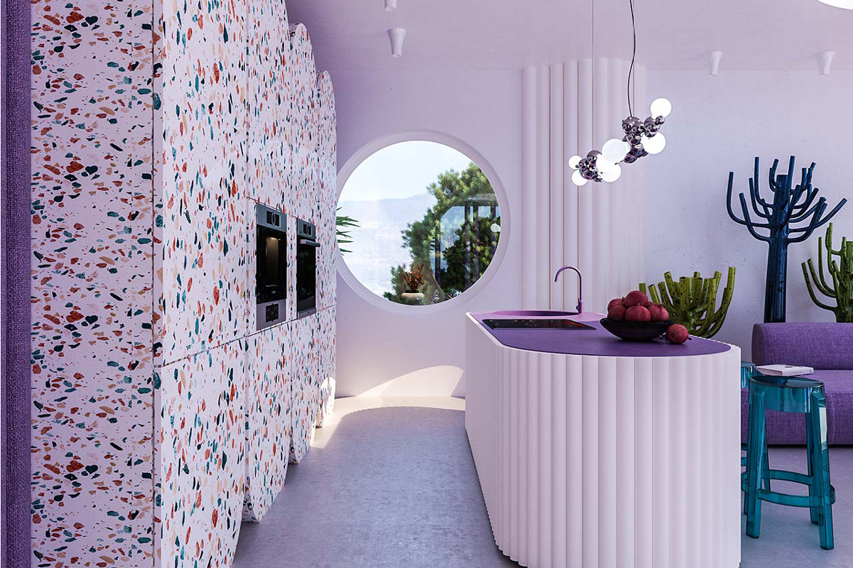 Everything was custom-built except for the sofa, chairs, and lamps. We even customized the bathroom. I’m always trying to offer extraordinary solutions. We used polyurethane, cement, concrete, copper, and plastic in this interior. Plastic works very well for me. I love using concrete, but not gray. I like playing with colors. And cement. You can make truly amazing things. I used terrazzo here as well. Terrazzo has become fashionable lately, but in fact it’s a material that’s long been known for combining, for example, cement and marble chips.