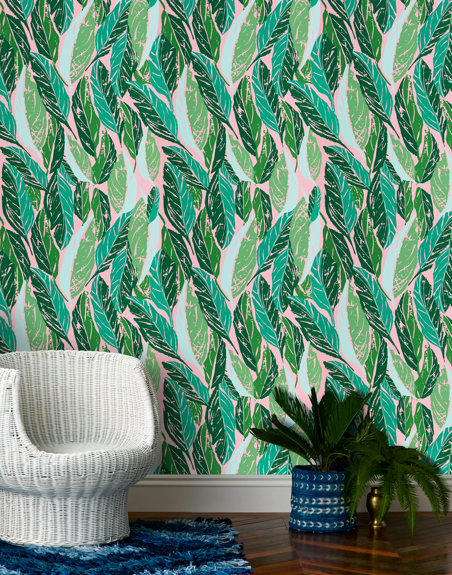 Nana, the green and pink wallpaper design, was inspired by the regal leaf of the banana tree.