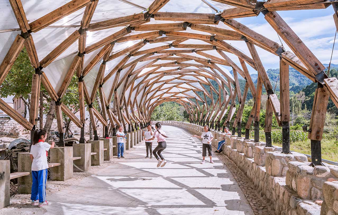 The pergola in Luotuowan Village uses wood reclaimed from local demolitions to make a structure that fits in with the surrounding mountains. ‘We didn’t cut or lengthen any wooden rod. Instead, we took into account the tolerance of length variation and ingeniously arranged the position of each wooden unit.’