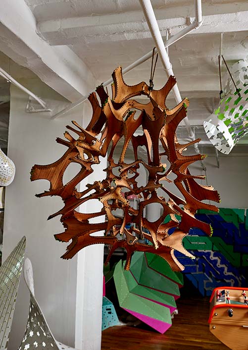 In the back corner of a large building in Dumbo, bars and shops at the base and a maze of offices and studios throughout, I find my way to an assembly of colorful, thin, planar elements: creatures, structures, surfaces. This is the space of Marc Fornes, architect and leader of THEVERYMANY, a New York-based studio specializing in large-scale, site-specific structures that unify skin, support, form, and experience into a single system. His otherworldly pavilions and public art installations transform spaces all over the world. Marc arrives a few minutes late, but it’s understandable. It snowed the night before—one of the few times this year—so much of the city is at a standstill. He didn’t anticipate not being able to zip over on his new scooter. We take off our dripping coats and Marc turns on all the lights, the heater, and offers water or tea.