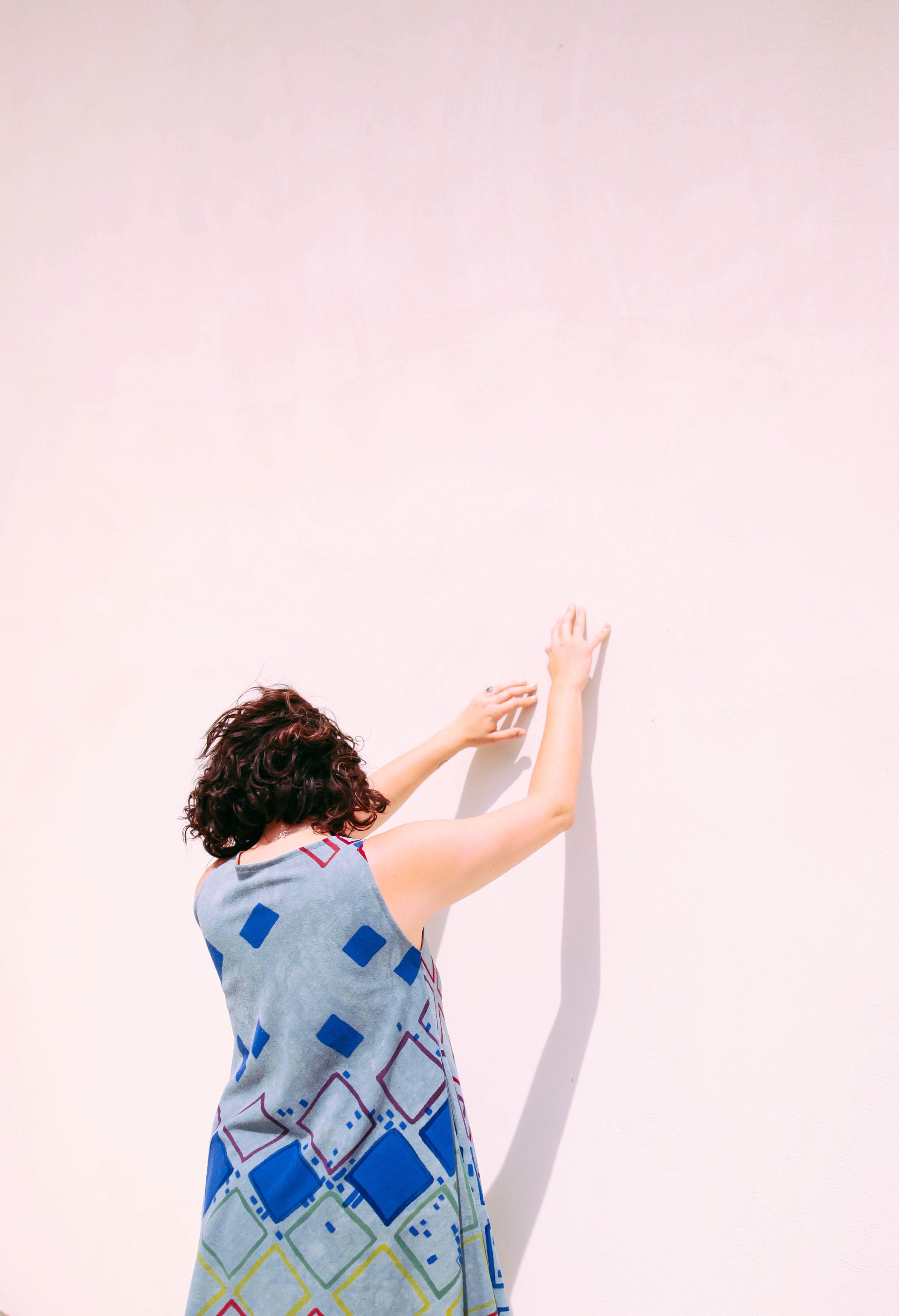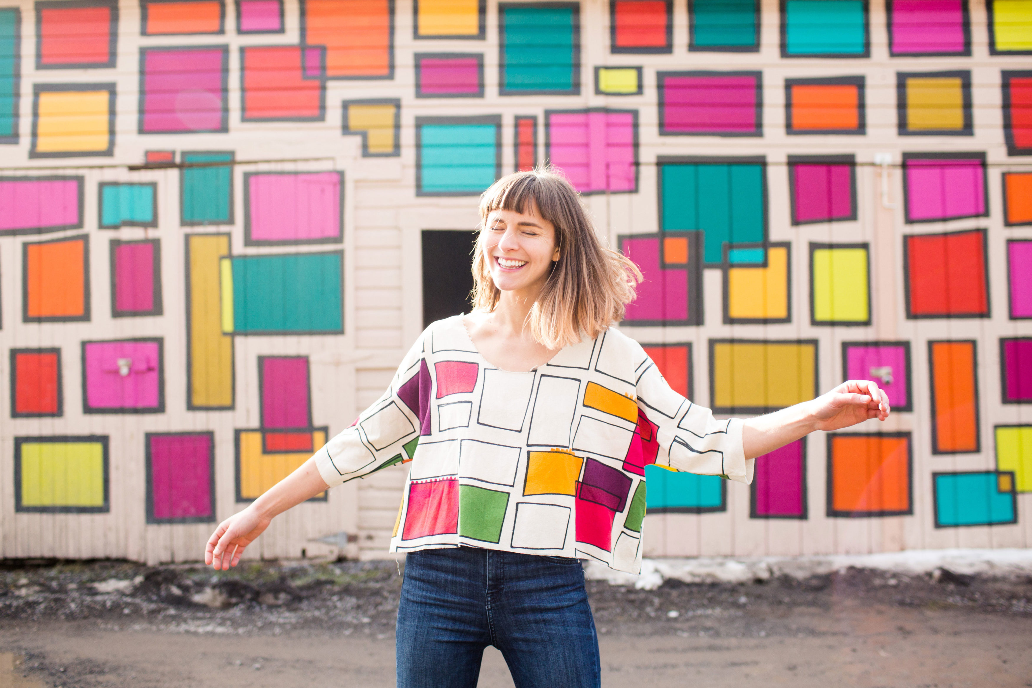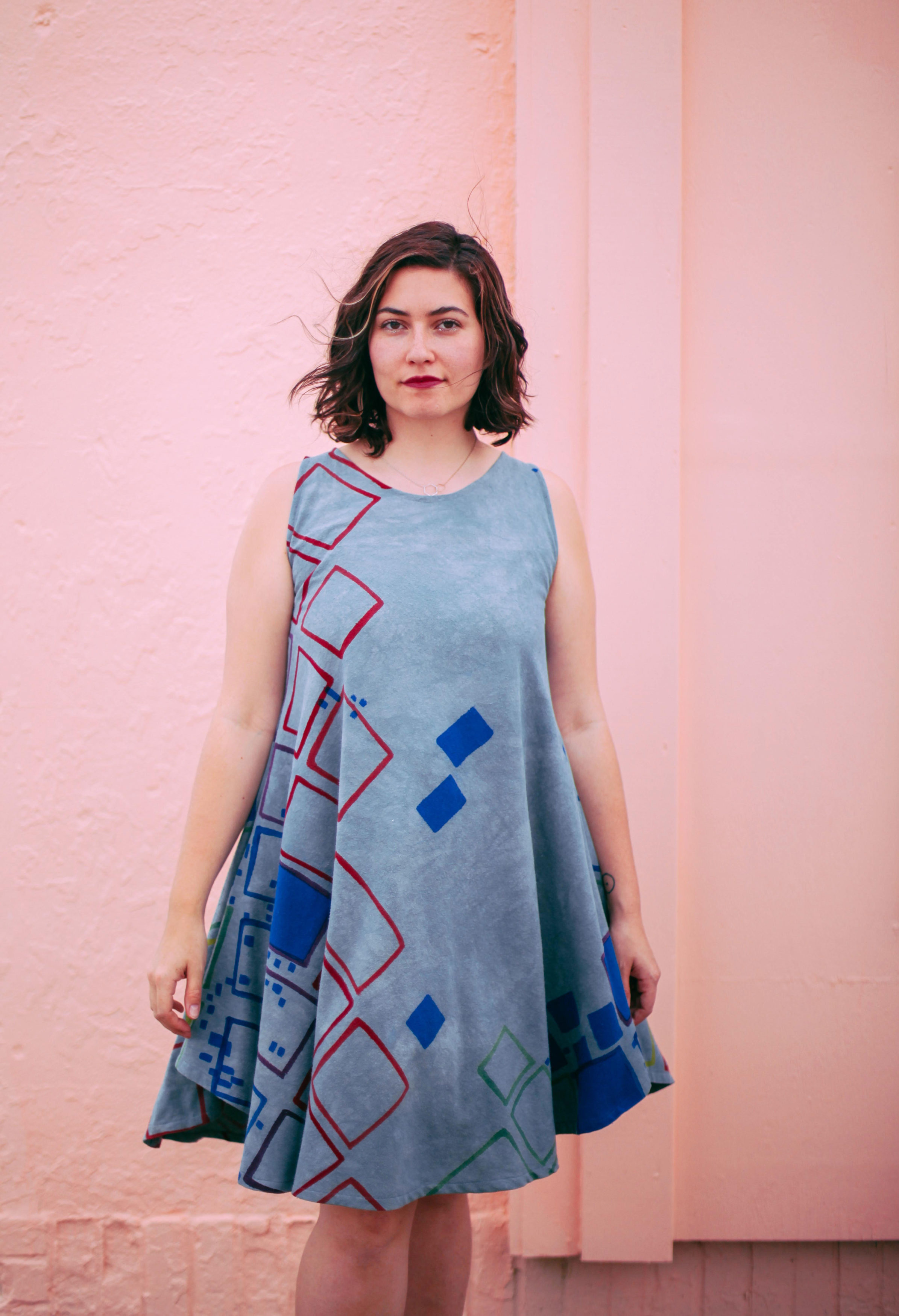Colorful squares, cheerfully blue asteroids, a splash of confetti and limes; artist Nellie Rose Davis spends much of her time hand-painting whimsical apparel. Each garment from Nellie Rose Textiles is one of a kind and takes up to two weeks to make.