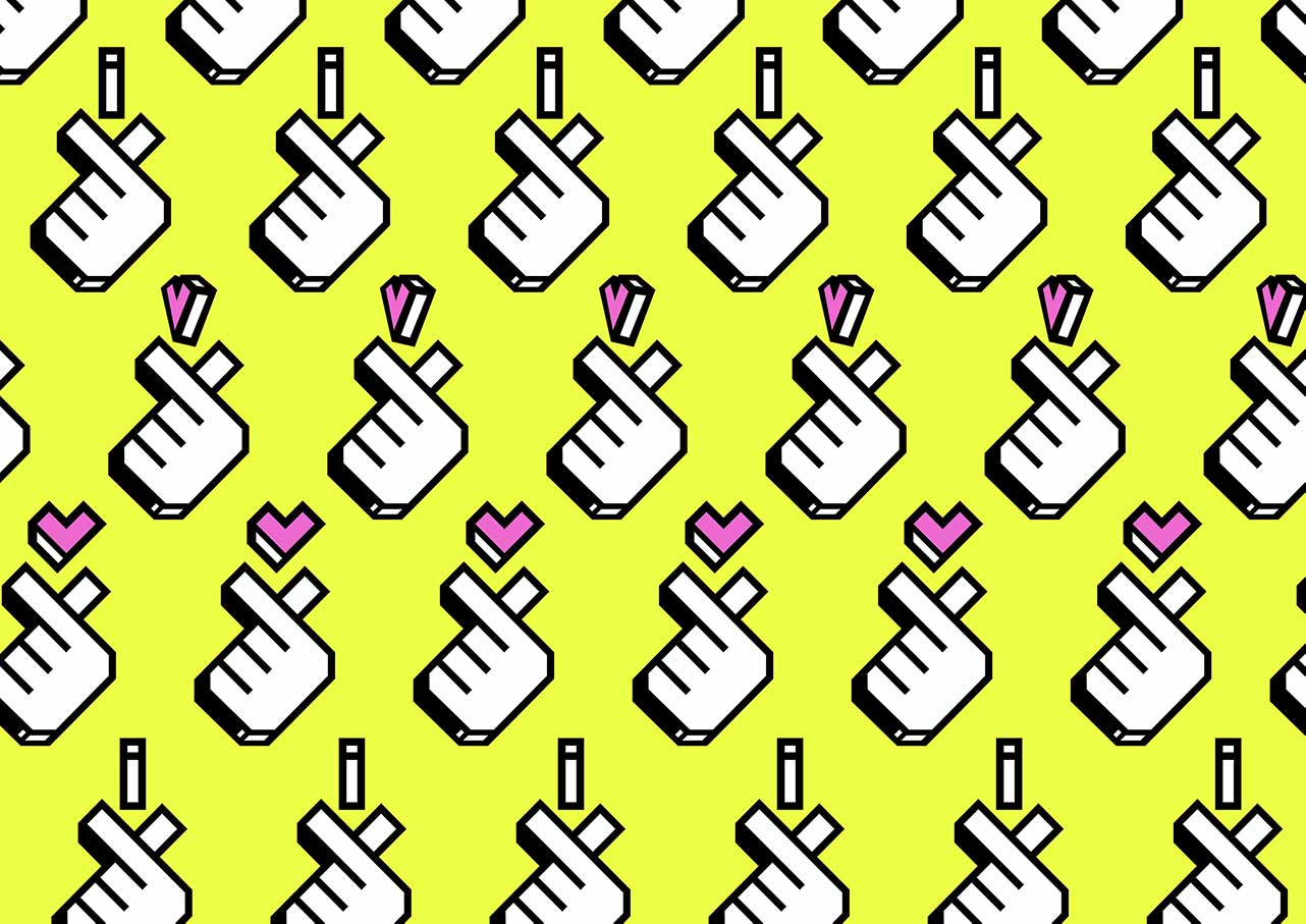 “Shanti designed the logo and graphic identity for K-Bomb, a European outlet for K-pop merch. Note the visual reference to the ‘finger heart,’ a popular gesture among K-pop devotees.”