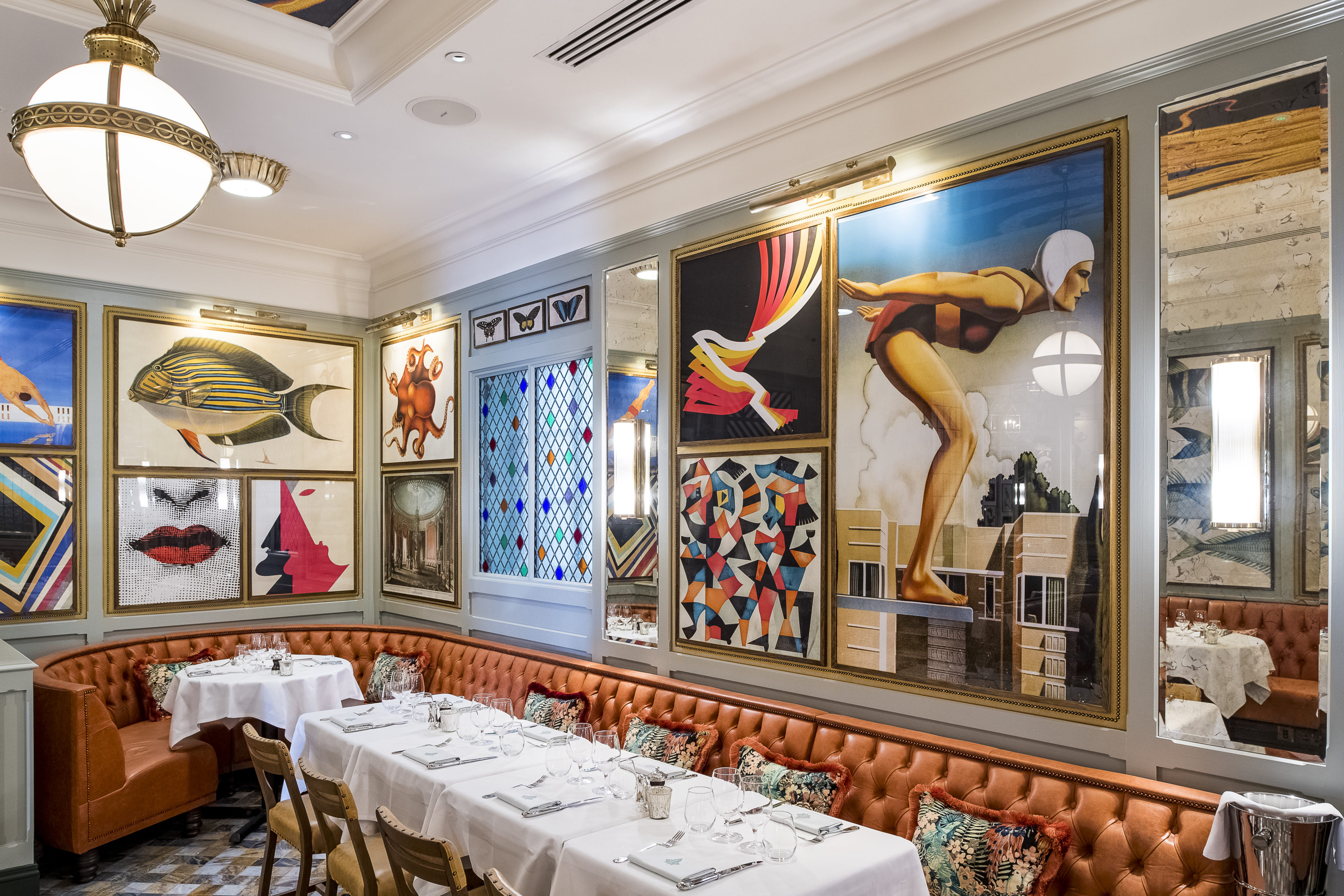 Opened in May 2018, the restaurant has an informal yet sophisticated interior design, with vintage prints and artwork inspired by Brighton lining its walls. Martin Brudnizki Design Studio consulted on the interiors. Even inside this seaside restaurant, diners can enjoy the Brighton beach, pier, tropical plants, and sea life—like the giant, intricately painted squids swimming across the ceiling in one of the rooms.